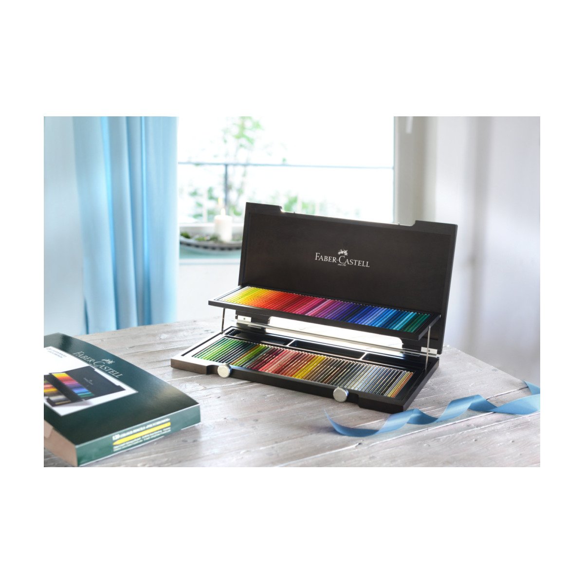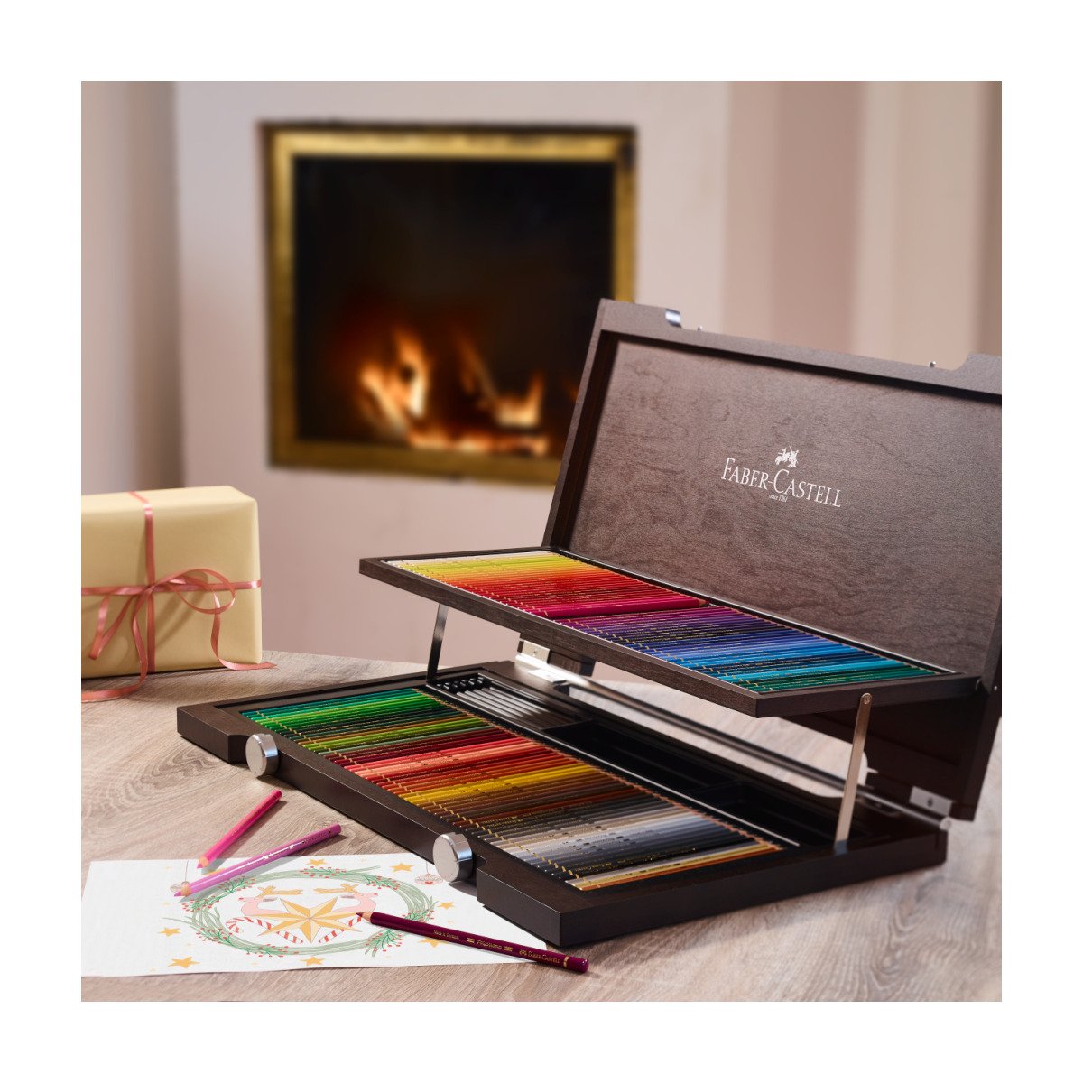 Kredki Polychromos zapakowane w ekskluzywne pudełko dwupoziomowe wykonane z drewna i specjalnie lakierowane.