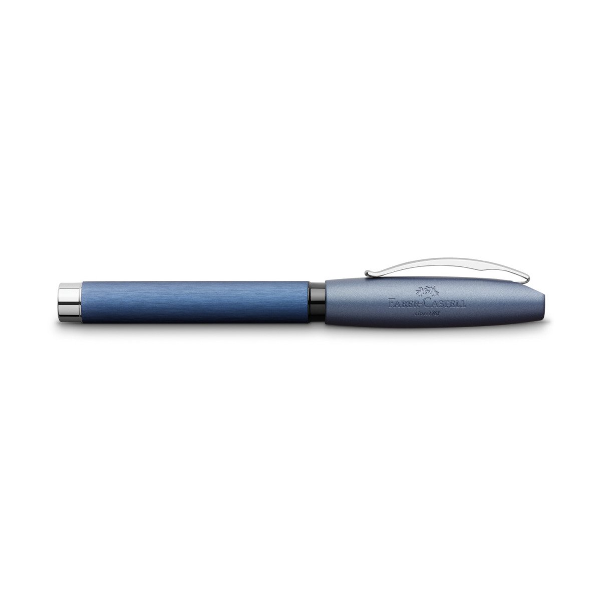 Pióro wieczne z serii Essentio Faber-Castell w kolorze niebieskim. To wyjątkowy przykład elegancji i funkcjonalności. Korpus wykonany został ze starannie anodowanego aluminium z delikatną szczotkowaną fakturą co nadaje mu lekkości i trwałości z wrażeniem soft-touch. Ergonomiczna strefa uchwytu z rowkami na powierzchni i odpowiednie wyważenie gwarantują wysoki komfort pisania. Elementy wykończenia i skuwka ze sprężynowym klipsem wykonane zostały z chromowanego i polerowanego metalu. Pióro wyposażone zostało w wysokiej jakości stalówkę ze stali nierdzewnej o szerokości linii pisania M (medium – średnia). Posiada podwójny system napełniania: konwerter z możliwością zamiany na naboje atramentowe. Konwerter dostępny osobno.