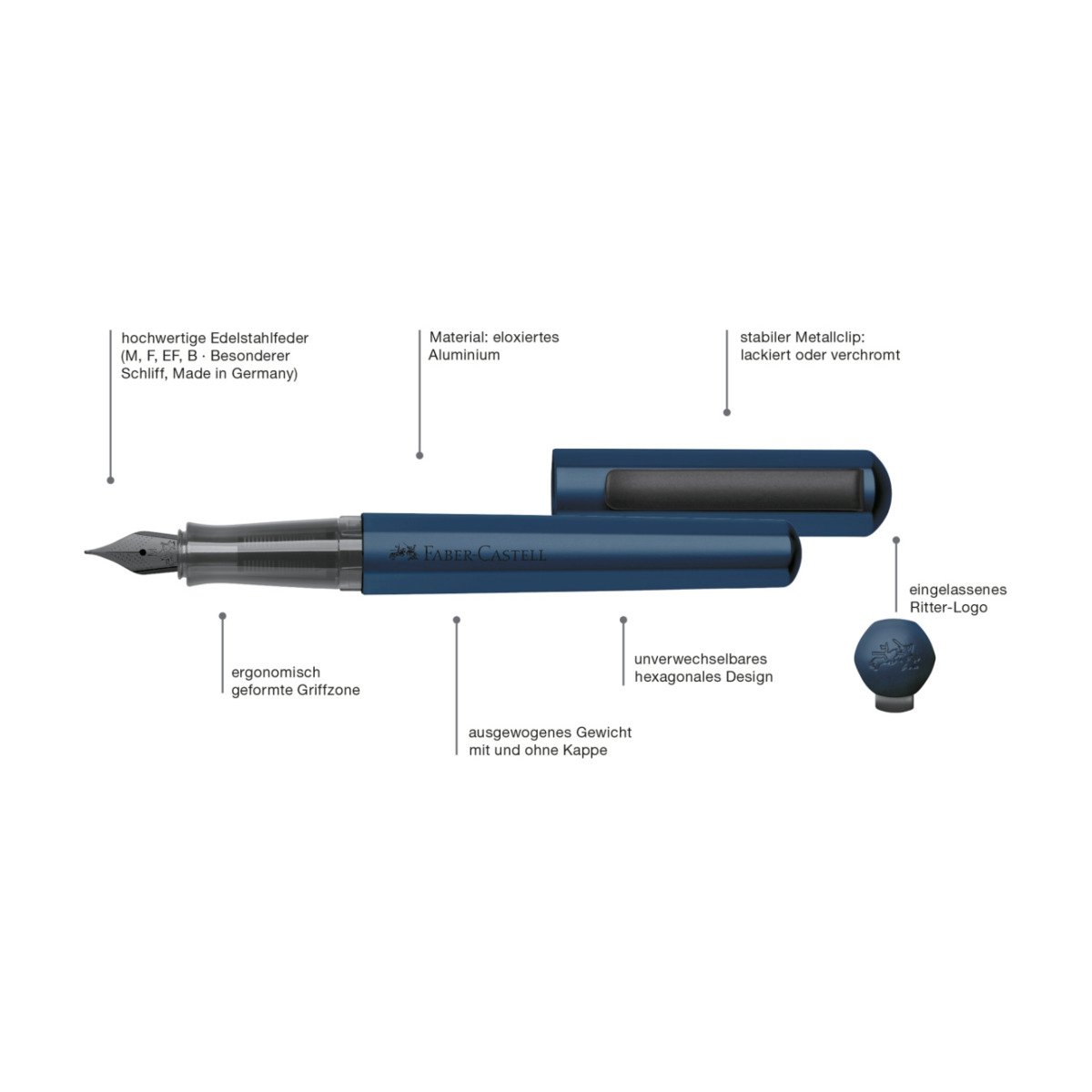 Unikalny, designerski sześciokątny kształt. Korpus wykonany z aluminium. Sprężynujący klips wykonany z metalu. Pióro wieczne wyposażone w stalówkę ze stali nierdzewnej w rozmiarze M. Na mechanizm tłokowy lub naboje (możliwość dokupienia konwertera), niebieski nabój startowy w zestawie. Kolor korpusu ciemnoniebieski.