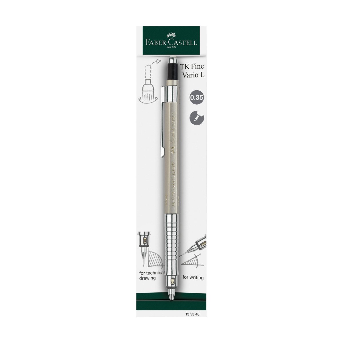 • Ołówek automatyczny TK-Fine Vario L Faber-Castell w kolorze champagne gold. Idealny do precyzyjnego rysowania, szkicowania i pisania. Wyposażony w mechanizm "miękki/twardy" - miękki: amortyzacja końcówki piszącej podczas pisania; twardy: końcówka pisząca solidnie utrzymuje się w osłonie podczas rysowania. Wygodny i ergonomiczny, dzięki antypoślizgowej, metalowej strefie uchwytu ze specjalnymi rowkami. Kolorystyczne rozróżnienie grubości linii pisania na końcówce ołówka. Okienko stopnia twardości można ustawić odpowiednio do używanego grafitu. Ze zintegrowaną gumką wysokiej jakości i metalowym klipsem. Średnica grafitu: 0,5 mm, stopień twardości HB.