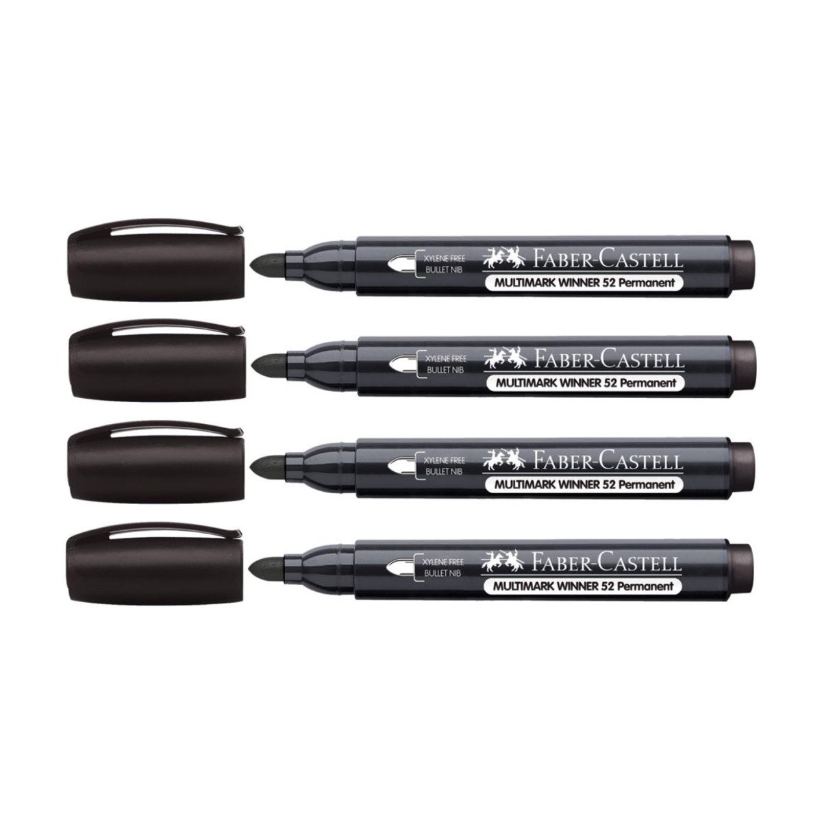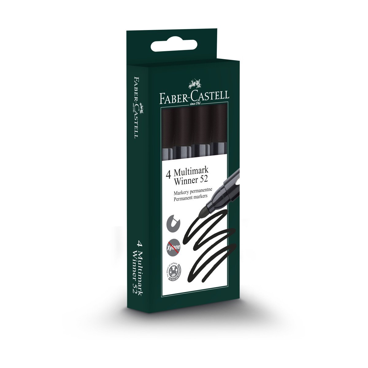 • Markery permanentne Multimark Winner 52 Faber-Castell zestaw 4 szt. w kolorze czarnym w opakowaniu kartonowym. Wodoodporne, odporne na działanie światła i szybkoschnące. Z tuszem na bazie alkoholu, idealne do niemal wszystkich powierzchni np. drewno, metal, szkło, plastik i karton. Okrągła końcówka pisząca z linią pisania o szerokości 2,8 mm. Ze skuwką i końcówką w kolorze tuszu.