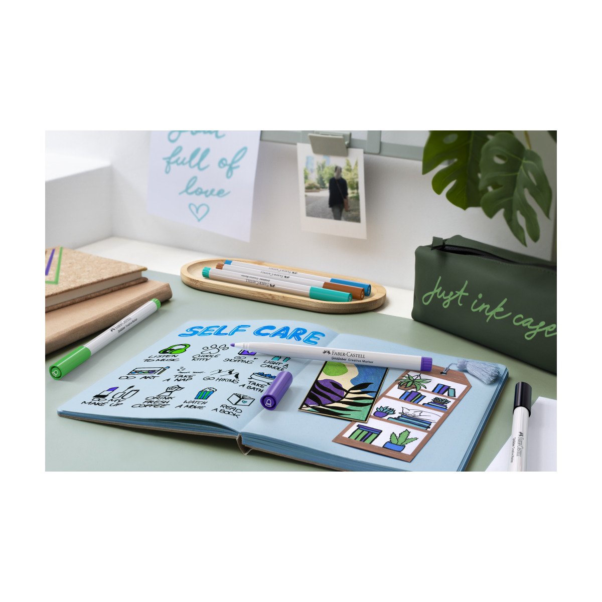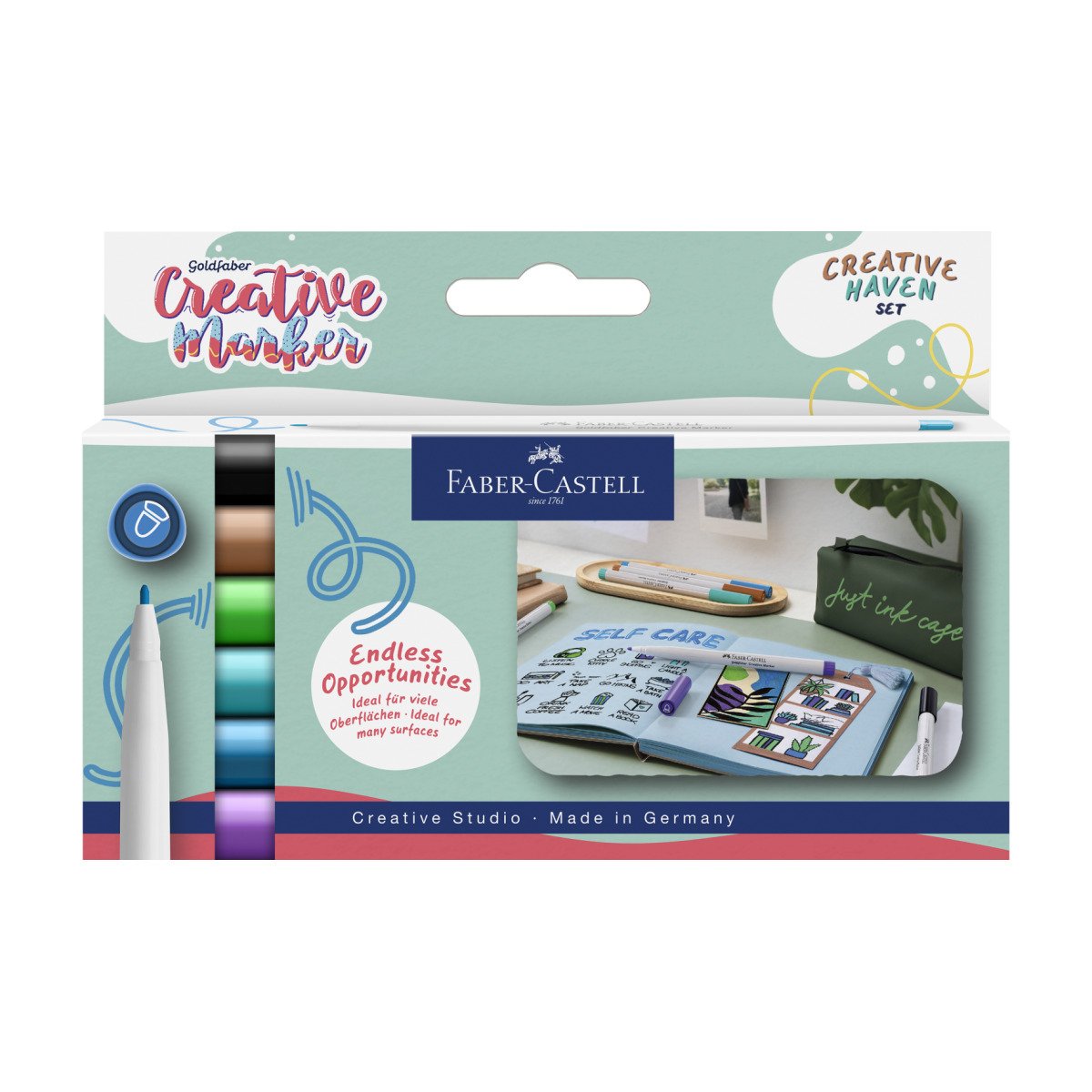 • Pisaki kreatywne Goldfaber Creative Faber-Castell zestaw 6 szt. w kolorach Creative Haven z okrągłą końcówką piszącą w rozmiarze 1,5 mm. To uniwersalne markery stworzone z myślą o nieograniczonej kreatywności i inspiracji. Odpowiednie do wszystkich powierzchni takich jak papier, szkło, tektura, metal, tworzywa sztuczne, folia, drewno, kamień i porcelana. Doskonale sprawdzają się na jasnych, kolorowych, jak i ciemnych powierzchniach. Wysokiej jakości tusz na bazie wody jest bezwonny i nie przesiąka się przez papier. Po wyschnięciu odporny na rozmazywanie i zachlapanie wodą. Dodatkowo po utrwaleniu w piekarniku 30 minut w temperaturze 160°C staje się wodoodporny. Nie nadaje się do mycia w zmywarce. Pisaki nie wymagają wstrząsania ani pompowania, co zapewnia wygodne i bezproblemowe użytkowanie. Dostępne w 3 wariantach końcówek piszących - pędzelkowej, kaligraficznej oraz okrągłej o grubości 1,5 mm – dla swobodnej ekspresji i eksperymentowania z różnymi stylami pisania i rysowania. To niezastąpione narzędzie zarówno do codziennych projektów, jak i bardziej wymagających, artystycznych realizacji.