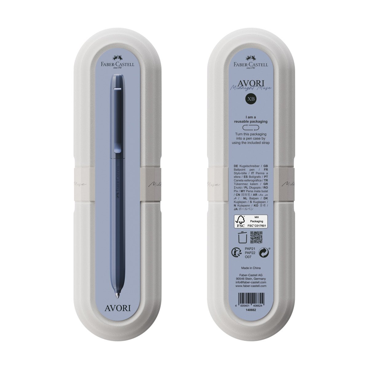 • Długopis Avori od Faber-Castell w kolorze Midnight Muse to wyjątkowe narzędzie do pisania, które łączy nowoczesny design z ponadczasową elegancją. Jego starannie zaprojektowane, fasetowane powierzchnie grają ze światłem i cieniem, tworząc niepowtarzalny efekt wizualny. Idealny na prezent – długopis zapakowany jest w estetyczne, wielofunkcyjne opakowanie papierowe, które może również pełnić rolę etui. Praktyczny pasek umożliwia jego wygodne zamknięcie, a solidny metalowy klips z funkcją samonaprężania gwarantuje bezpieczne mocowanie. Avori to także świadomy wybór – plastikowe elementy wykonano w 92% z materiałów pochodzących z recyklingu. Długopis wyposażono w płynnie piszący, niebieski wkład o szerokości linii XB oraz niezawodny mechanizm obrotowy, co czyni go idealnym towarzyszem codziennych notatek, planów i kreatywnych manifestacji. Dostępny również w 5 innych kolorach.