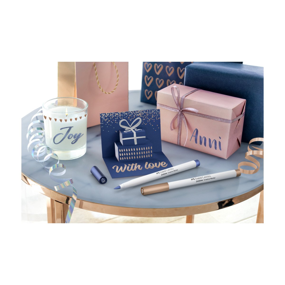 • Pisaki kreatywne Goldfaber Creative Faber-Castell zestaw 6 szt. w kolorach Holiday z pędzelkową końcówką piszącą B. To uniwersalne markery stworzone z myślą o nieograniczonej kreatywności i inspiracji. Odpowiednie do wszystkich powierzchni takich jak papier, szkło, tektura, metal, tworzywa sztuczne, folia, drewno, kamień i porcelana. Doskonale sprawdzają się na jasnych, kolorowych, jak i ciemnych powierzchniach. Wysokiej jakości tusz na bazie wody jest bezwonny i nie przesiąka się przez papier. Po wyschnięciu odporny na rozmazywanie i zachlapanie wodą. Dodatkowo po utrwaleniu w piekarniku 30 minut w temperaturze 160°C staje się wodoodporny. Nie nadaje się do mycia w zmywarce. Pisaki nie wymagają wstrząsania ani pompowania, co zapewnia wygodne i bezproblemowe użytkowanie. Dostępne w 3 wariantach końcówek piszących - pędzelkowej, kaligraficznej oraz okrągłej o grubości 1,5 mm – dla swobodnej ekspresji i eksperymentowania z różnymi stylami pisania i rysowania. To niezastąpione narzędzie zarówno do codziennych projektów, jak i bardziej wymagających, artystycznych realizacji.