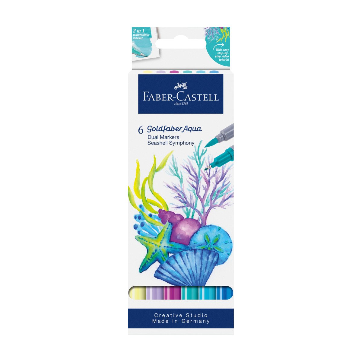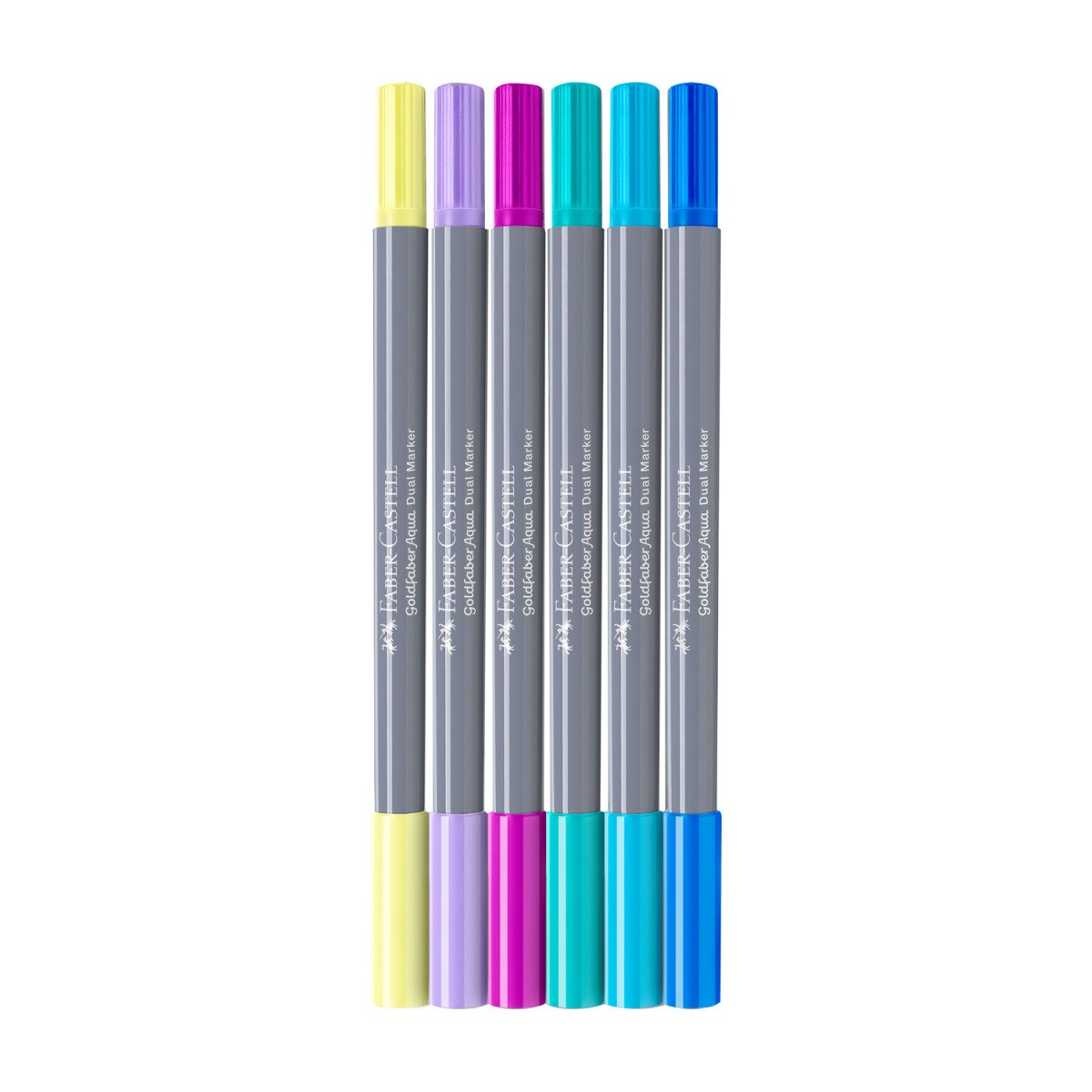 • Zestaw dwustronnych pisaków akwarelowych Goldfaber Aqua Pineapple Faber-Castell w opakowaniu 6 szt. Zachwycają niezwykłą intensywnością kolorów oraz wszechstronnością zastosowania. Przy użyciu mokrego pędzla szkic lub motyw zaprojektowany za pomocą tych pisaków można zamienić w wspaniały obraz z efektem akwareli. Pozwalają na dużo bardziej precyzyjną pracę niż przy użyciu tradycyjnych farb akwarelowych. Doskonałe do wszelkich zastosowań kreatywnych i artystycznych. Każdy pisak ma dwie końcówki: miękką, elastyczną końcówkę pędzelkową do zadań artystycznych i cienką końcówkę 0,6 mm do konturów i detali. Tusz na bazie wody jest bezwonny i bezkwasowy, o neutralnym PH. Nie pozostawia smug i nie przecieka przez papier oraz jest w pełni rozpuszczalny w wodzie. Zatyczki i korpus są wykonane w 100% z materiału pochodzącego z recyklingu, w związku z czym mogą pojawić się niewielkie różnice kolorystyczne w częściach zewnętrznych.